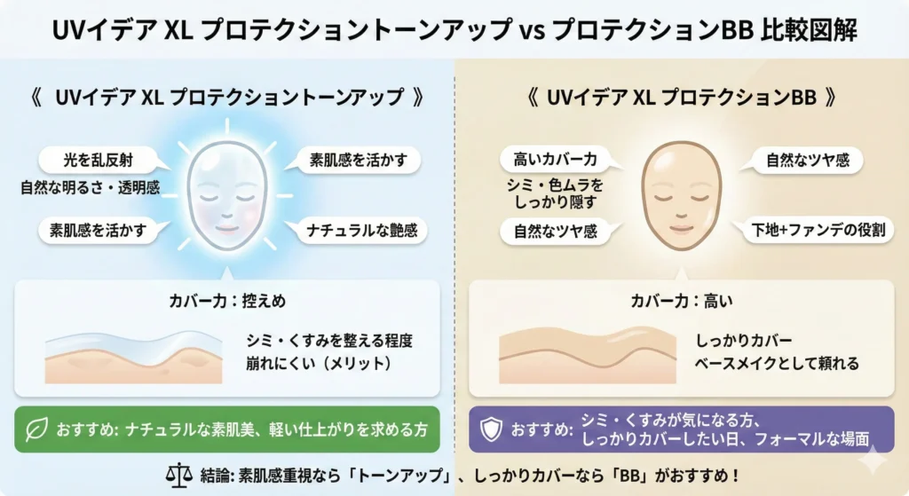 「UVイデア XL プロテクショントーンアップ」と「UVイデア XL プロテクションBB」は、カバー力において大きな違いがあります。