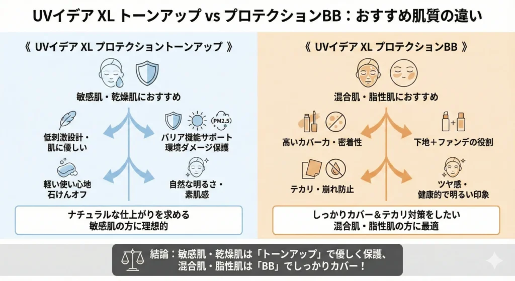 「UVイデア XL プロテクショントーンアップ」と「UVイデア XL プロテクションBB」は、それぞれの特性に合わせたおすすめの肌質があります。
